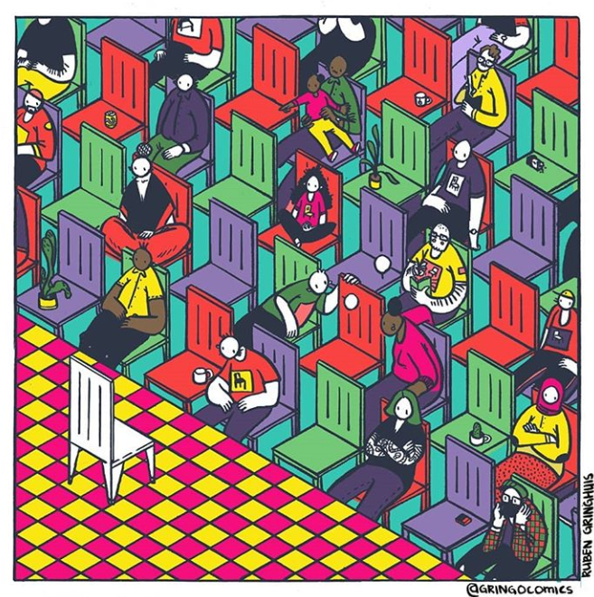 “Ik reserveer stoelen voor ons bij het open podium volgende maand. Ik heb voor mezelf ook een plekje gereserveerd óp het podium. Het is nog leuker als jullie ook iets doen, maar ik vond het wat te ver gaan om jullie daar ook nog ongevraagd voor aan te melden. Dus dat mag je zelf doen als je zin hebt.”